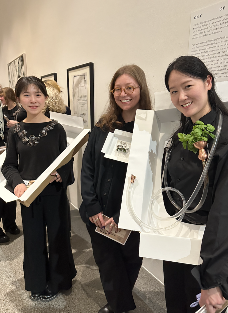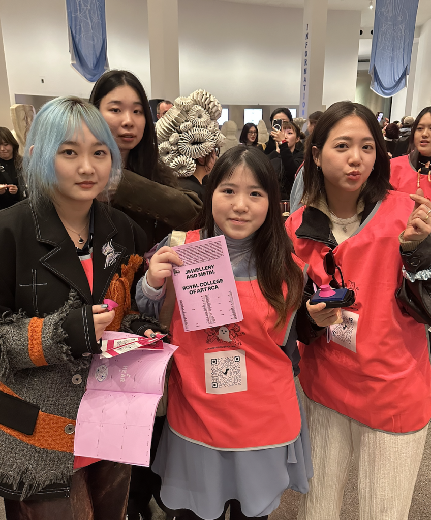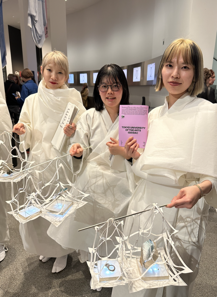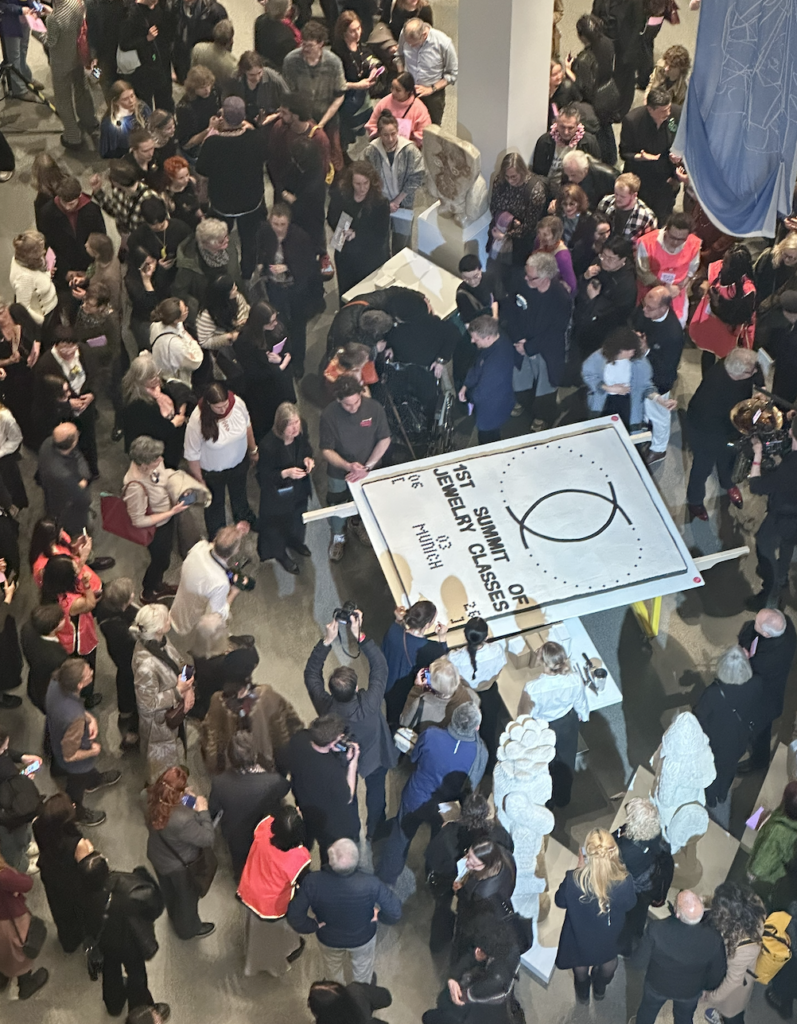 Delle premesse di questo 1st Summit of Jewelry Classes sapete tutto dal post di ieri. Quello che si poteva immaginare, studenti e professori di 42 scuole di gioiello da tutto il mondo in una stessa sera in uno stesso luogo si è realizzato veramente. Direi almeno 1500 persone in giro per tutto il museo, piccole performance di gruppetti di studenti, gioielli indossati o “animati” su ciambelle salvagente o infilati in valigette trasparenti pronti all’uso come “medicinali” dagli studenti coreani. Gioielli offerti allo sguardo su un vassoio di alluminio dagli studenti di Amsterdam, presentati su un lungo telo nero retto dai ragazzi e ragazze messicani. Veramente di tutto da tutto il mondo e con grande fantasia.